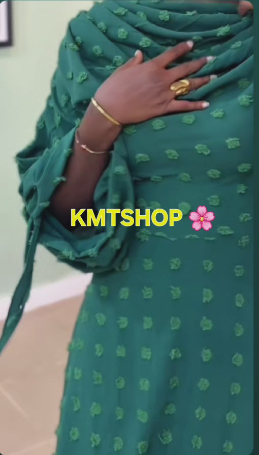 Grâce à son col drapé imposant, cette robe se suffit à elle-même. Accompagnez-la d'une parure de bijoux fins et dorés pour souligner l'éclat du tissu. Un hijab en soie ou en satin ton sur ton complétera parfaitement ce look magnifique !